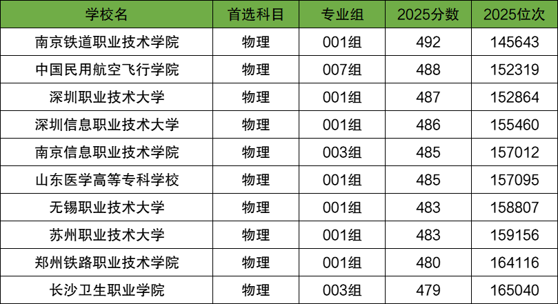 全国专科大学(分数线排名前十院校专业组)在安徽物理类录取分数线: