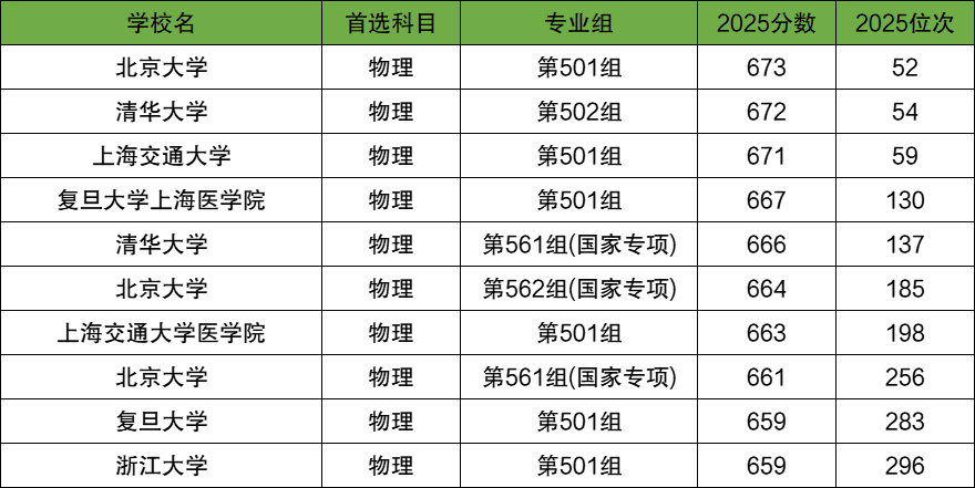 全国本科大学(分数线排名前十院校专业组)在江西物理类录取分数线: