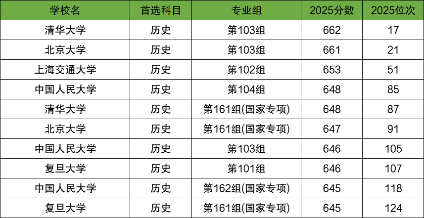 全国本科大学(分数线排名前十院校专业组)在江西历史类录取分数线:
