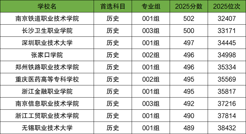 全国专科大学(分数线排名前十院校专业组)在安徽历史类录取分数线: