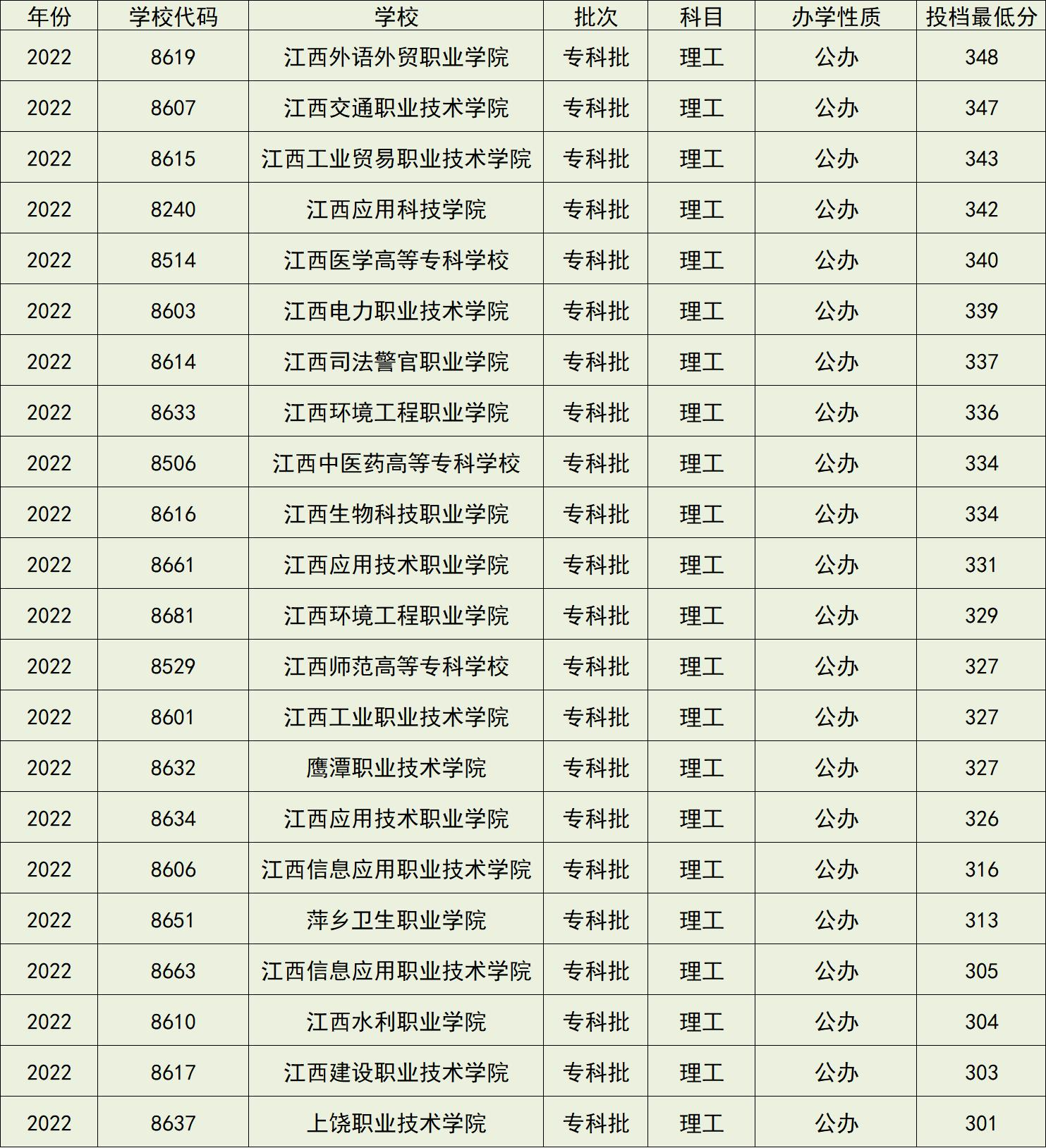 300至350分之间,江西省共有23所理科类公办专科可以报考,投档分最低的为上饶职业技术学院,最低投档分为301。