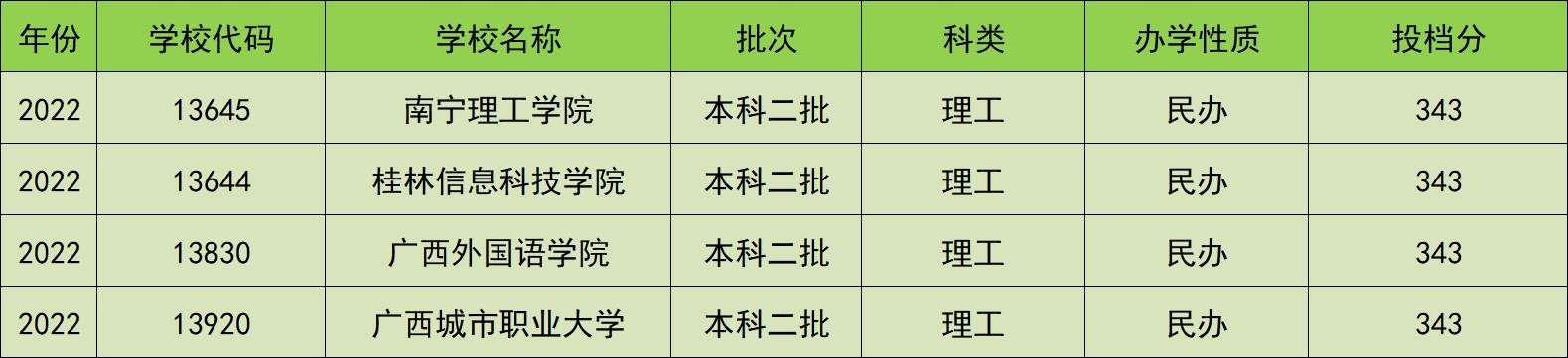 300至350分之间,广西在本省可以录取的本科院校有4所,最低投档分都是343分。