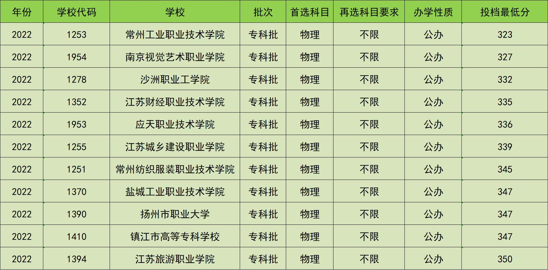 300至350分之间,江苏省共有11所物理类公办专科院校可以报考,投档分数线最低的是常州工业职业技术学院,最低投档分为323。