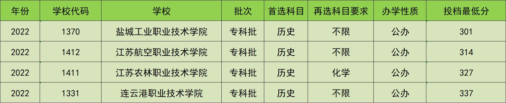 300至350分之间,江苏省共有4所历史类公办专科院校可以报考,投档分数线最低的是盐城工业职业技术学院,最低投档分为301。