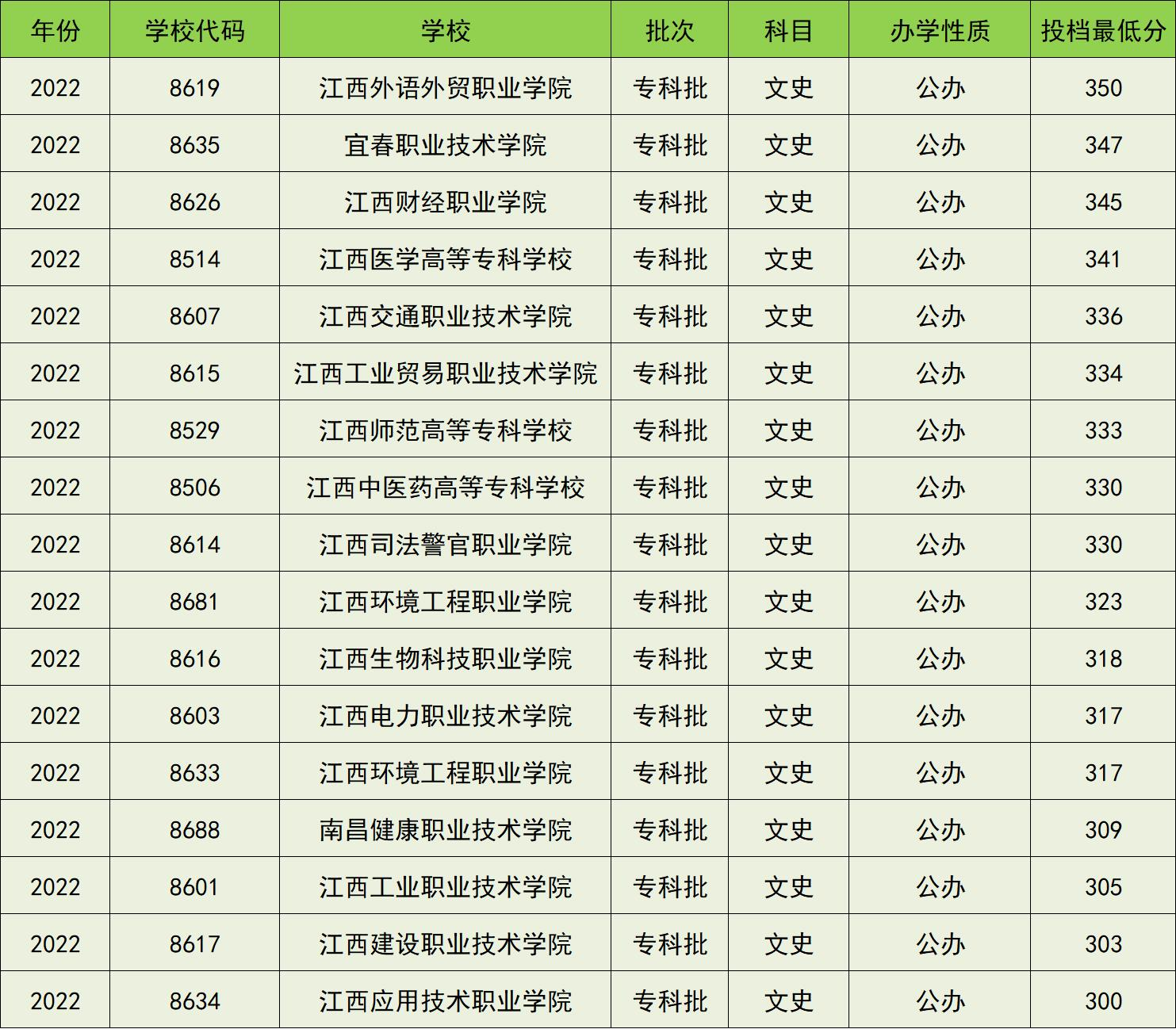 300至350分之间,江西省共有17所文科类公办专科可以报考,投档分最低的为江西应用技术职业学院,最低投档分为300。