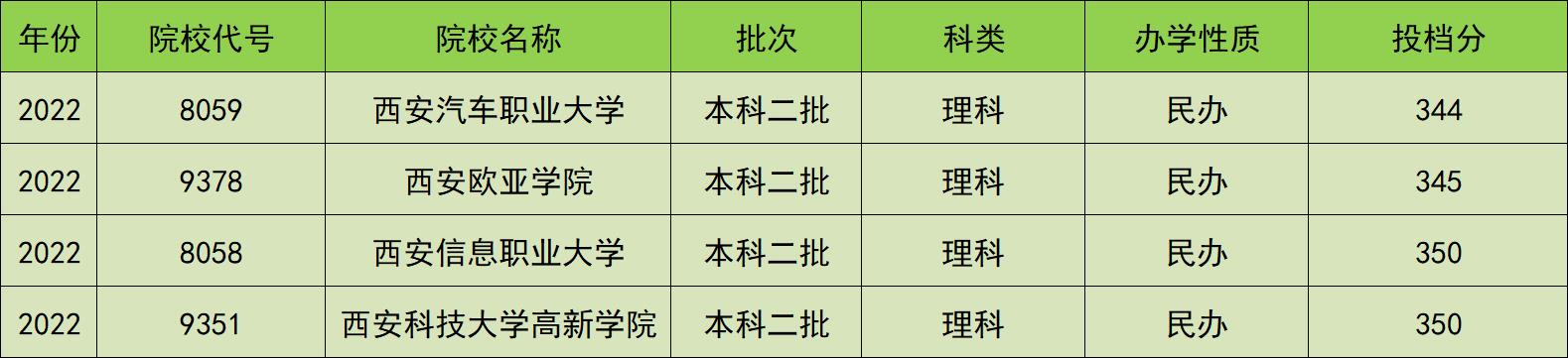 300至350分之间,陕西在本省可以录取的本科院校也是4所,西安汽车职业大学的投档分最低为344分。