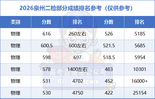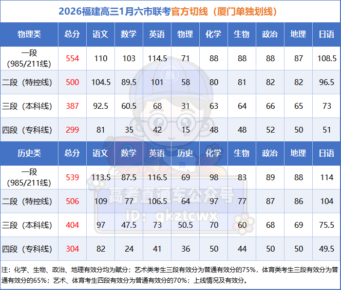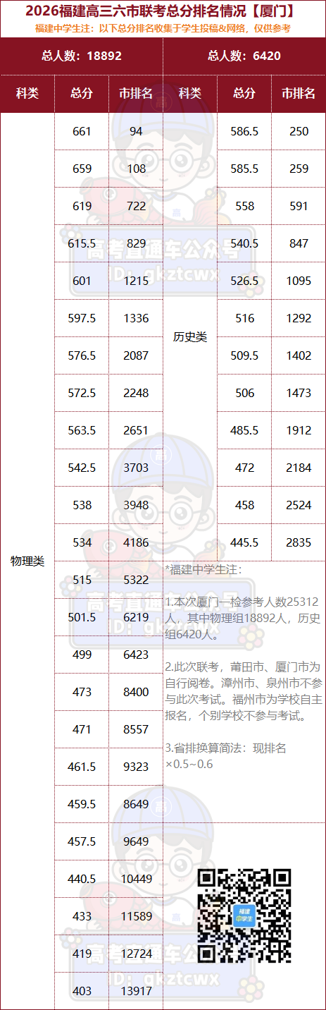 2026年福建高三质检分数线公布!其中福建六市联考厦门切线一:一段线530分、一本线494分、本科线393分。总分成绩排名表显示:601分物理类市排名1215名、558分历史类市排名591分等。