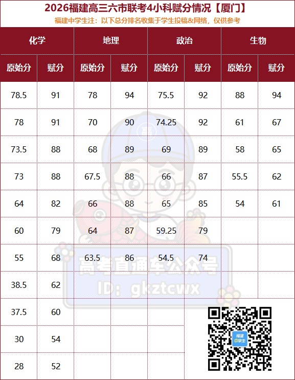 化学原始分78.5分可赋91分、地理原始分78分可赋94分、政治69分可赋89分、生物原始分88分可赋94分。