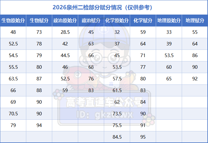 化学科目91.5分赋分98分、生物科目92.5分赋分97分、政治科目78.5分赋分96分、地理科目70分赋分91分。