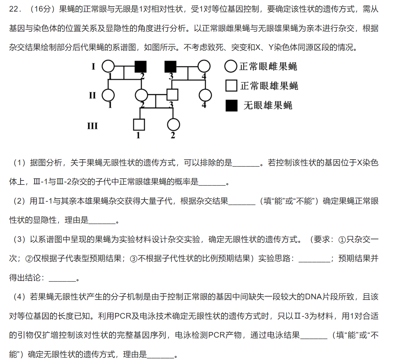 (4)①不能 ②若无眼性状的遗传伴X隐性遗传,PCR扩増后电泳的产物只有一条显示;若无眼性状的遗传常染色体隐性遗传,PCR扩增后电泳的产物有两条显示带;若无眼性状的遗传常染色体显性遗传,PCR扩增后电泳的产物有一条显示带