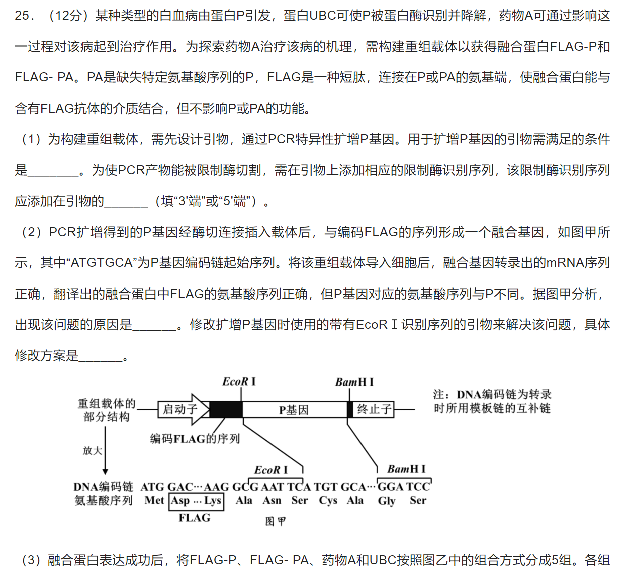 (2)①在转录出的mRNA中,限制酶识别序列对应的最后两个碱基与P基因对应的第一个碱基构成一个密码子,导致读码框改变,翻译出的氨基酸序列改变。 ②在EcoRI识别序列前后增加碱基,使其碱基数日加上FLAG的碱基数口为3的倍数