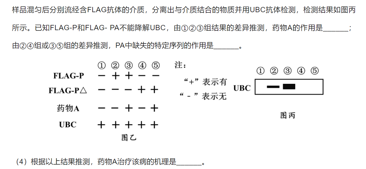 (3)①促进UBC与FLAG-P的结合 ②P△中缺失的特定序列是与UBC结合的关键序列