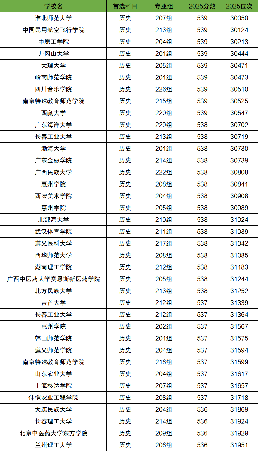 根据国内各个高校在广东历史类的招录数据可知,2025年广东高考历史类成绩在3万名到3.2万名的考生能上的院校专业组有37个,对应的分数为539分~536分。