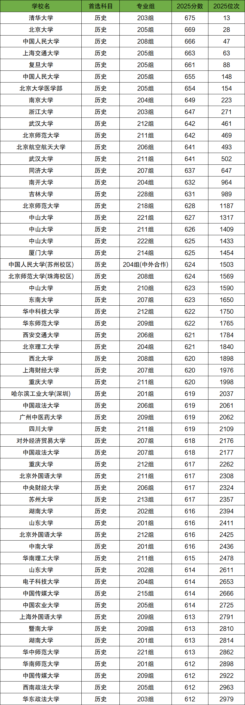 根据国内各个高校在广东历史类的招录数据可知,2025年广东高考历史类成绩在3千名之前的考生能上的院校专业组有59个,对应的分数为675分~612分。
