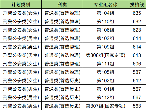 2025年中国刑事警察学院湖南各个专业组录取分数线是: