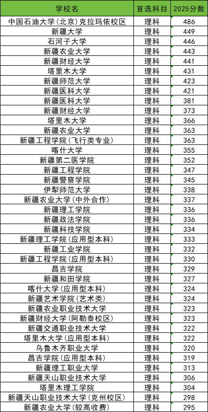 本文根据新疆教育考试院发布的《新疆维吾尔自治区2025年普通类本科批次平行志愿投档线》为依据,为大家整理了新疆维吾尔自治区内各本科院校文科和理科的录取分数线。