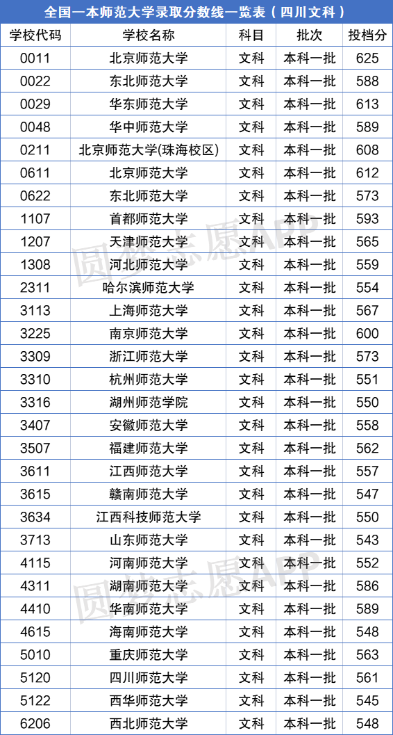 在四川一本中,文科投档分数线最高的是北京师范大学625分,超过了本科线159分;投档分数线最低的是西北师范大学548分,超过了本科线122分。