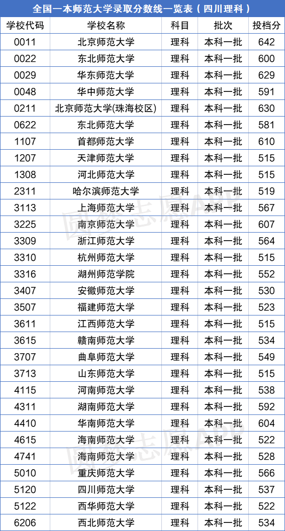 在四川一本中,理科投档分数线最高的是北京师范大学642分,超过了本科线216分,投档分数线最低的是西北师范大学534分,超过了本科线108分。