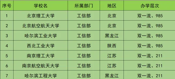 7所国防七子大学排行榜中,各所高校的排名情况是哈尔滨工业大学第一名、北京航空航天大学第二名、西北工业大学第三名等,在本文老师就为各位具体展示出国防七子大学全部名单及排名,并为大家提供全国国防七子大学录取分数线。