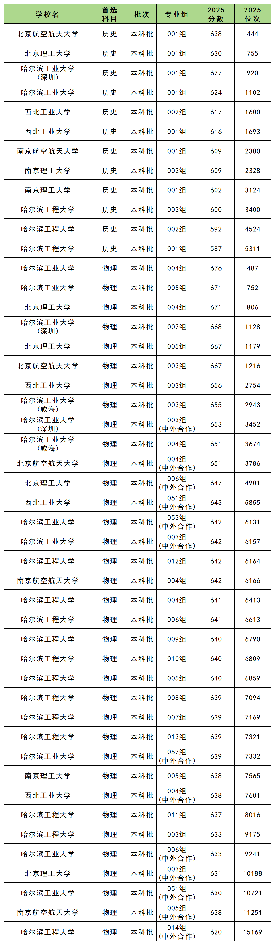 如下为各位展示的是2025年安徽国防七子院校的录取分及位次情况: