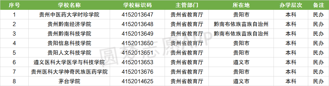 贵州省民办本科大学有贵州中医药大学时珍学院、贵州黔南经济学院、贵州黔南科技学院、贵阳信息科技学院、贵阳人文科技学院、遵义医科大学医学与科技学院、贵州医科大学神奇民族医药学院、茅台学院等8所大学。