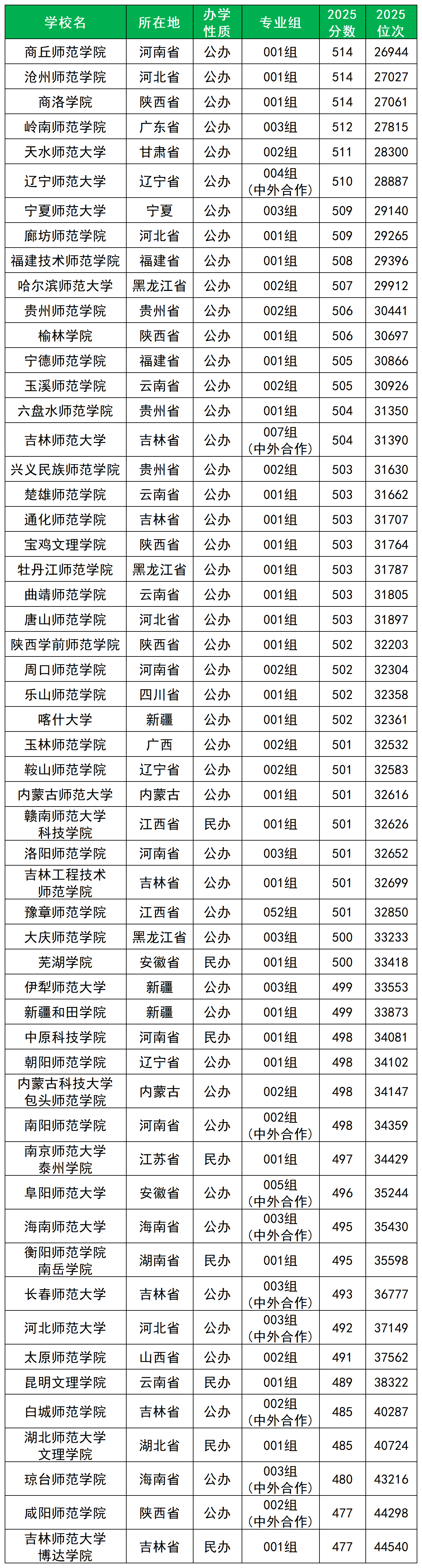 录取分数线与本科持平的院校为吉林师范大学博达学院。此外分数较低的院校还有齐鲁师范学院 (463分)、湖北师范大学文理学院( 470分)、琼台师范学院 (473分)、河南师范大学 (473分)。