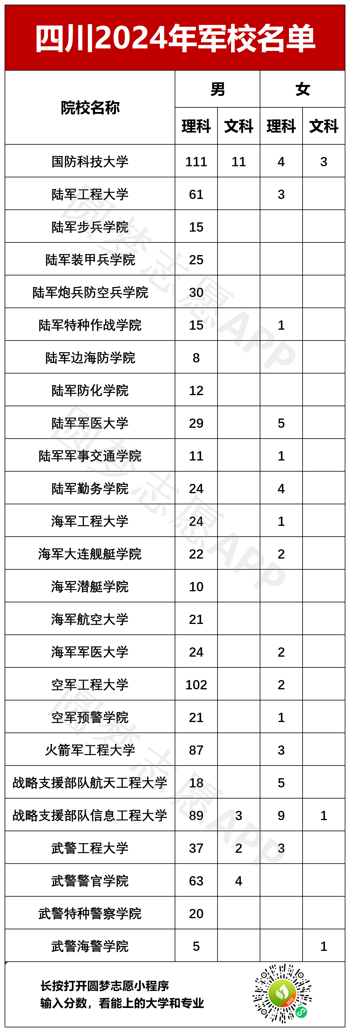 但是在四川招生的军校不止上述1所,根据2024年的招生计划来看,在四川招生的军校包括国防科技大学、陆军工程大学、陆军步兵学院等25所,具体名单如下: