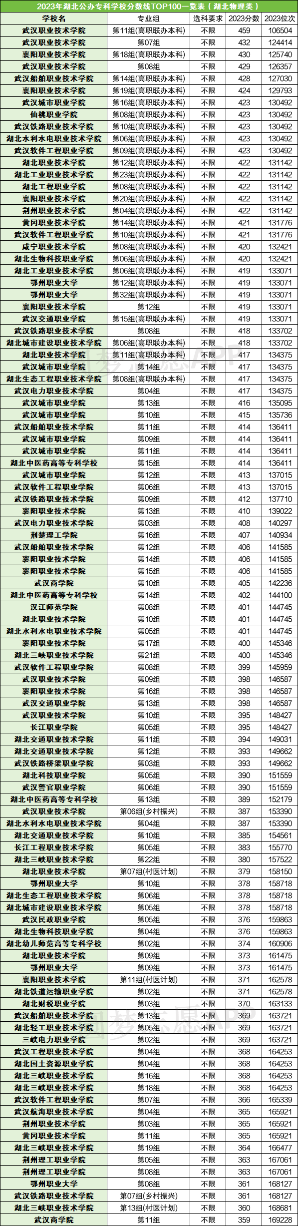 由于湖北的专科院校在省内都是按照院校专业组招生的,因而数据庞杂,由于本文篇幅有限,在此整理的是湖北专科院校在物理类排名前100的院校专业组。