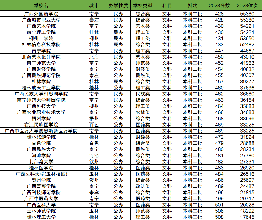 广西外国语学院(428分)、广西城市职业大学(428分)、广西艺术学院(430分)、南宁理工学院(430分)、柳州工学院(431分)、桂林信息科技学院(433分)、南宁学院(447分)、北海艺术设计学院(450分)、南宁师范大学(452分)、广西财经学院(454分),以下为2023年广西壮族自治区文科所有二本大学分数线。