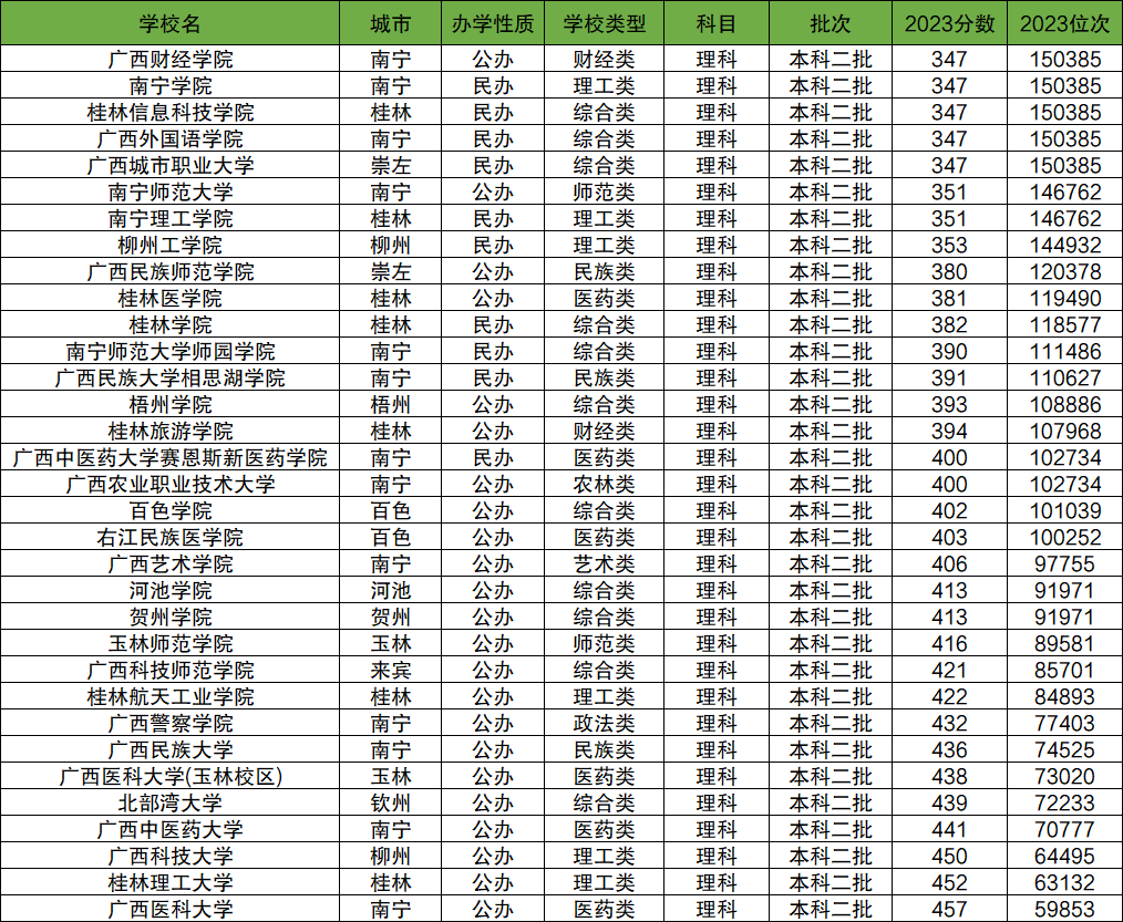 广西财经学院(347分)、南宁学院(347分)、桂林信息科技学院(347分)、广西外国语学院(347分)、广西城市职业大学(347分)、南宁师范大学(351分)、南宁理工学院(351分)、柳州工学院(353分)、广西民族师范学院(380分)、桂林医学院(381分),以下为2023年广西壮族自治区理科所有二本大学分数线。