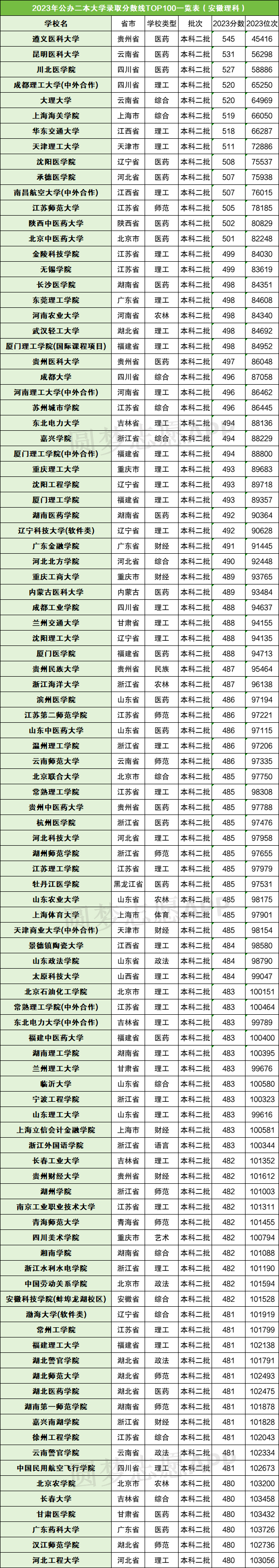 由于全国二本院校数量众多,且二本大学在不同省市的录取分数线有所不同,在此小编以安徽省为例,并根据圆梦志愿提供的数据,整理了2023年二本大学在安徽理科和文科的录取分数线TOP100一览表,如下: