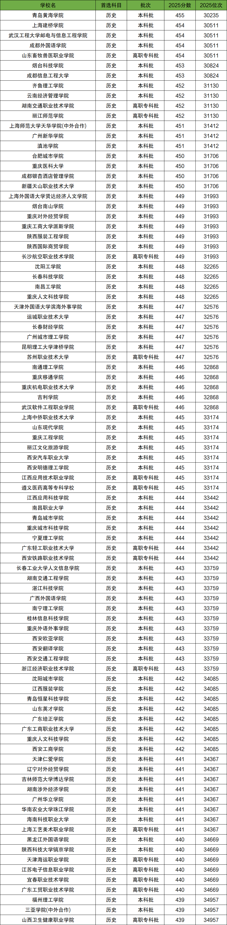根据国内各个高校在重庆历史类的招录数据可知,2025年重庆高考历史类成绩在3万名到3.5万名的考生能上的院校有91所,对应的分数为455分~439分。
