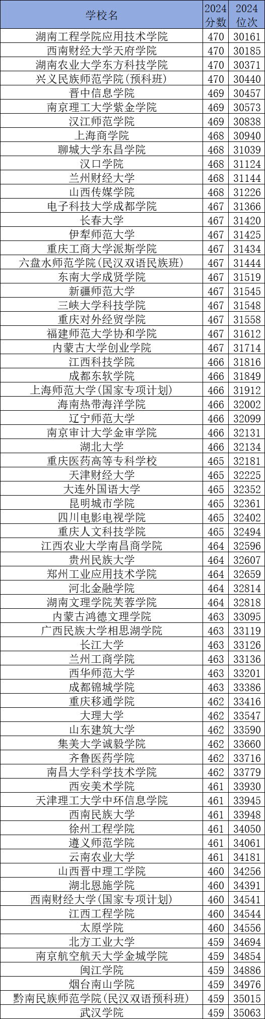 在这个范围内,录取分数线最高的是湖南工程学院应用技术学院、西南财经大学天府学院等4所院校,最低分为470分,最低位次30161位;