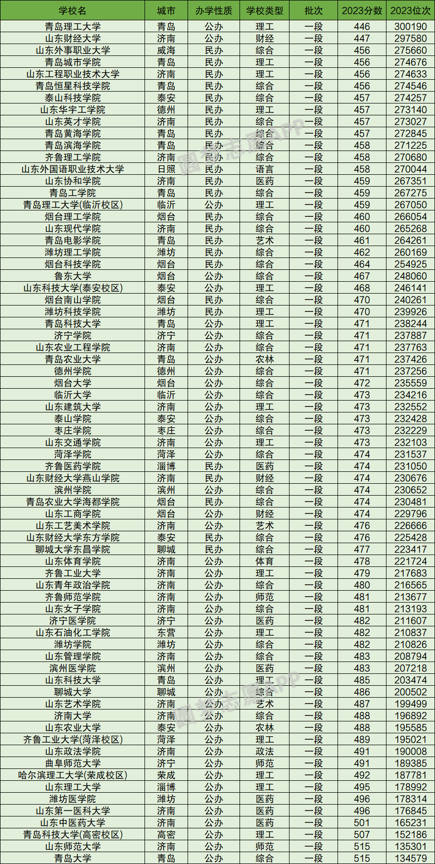 青岛理工大学(446分)、山东财经大学(447分)、山东外事职业大学(456分)、青岛城市学院(456分)、山东工程职业技术大学(456分)、青岛恒星科技学院(456分)、泰山科技学院(457分)、山东华宇工学院(457分)、山东英才学院(457分)、青岛黄海学院(457分),以下为2023年山东省所有二本大学分数线。