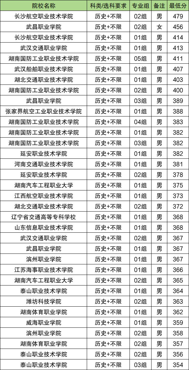 历史组男生分数线最高的是湖南汽车工程职业大学,2025最低分426分;分数线最低的是江南西航空职业技术学院,2025专科提前批最低分为419分。