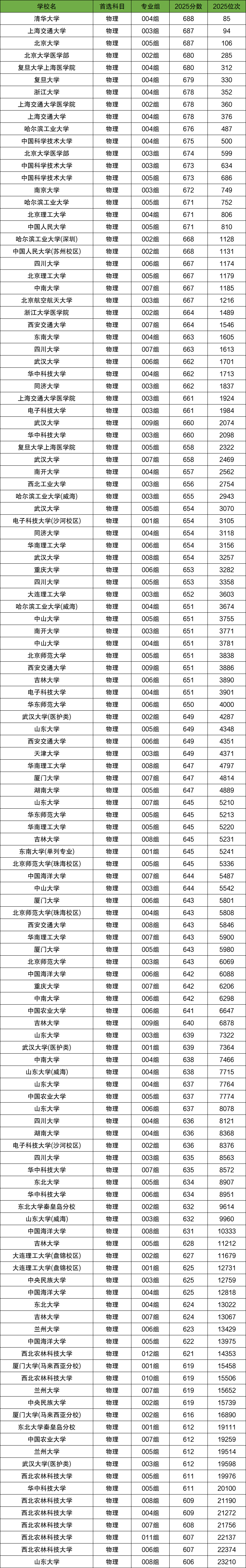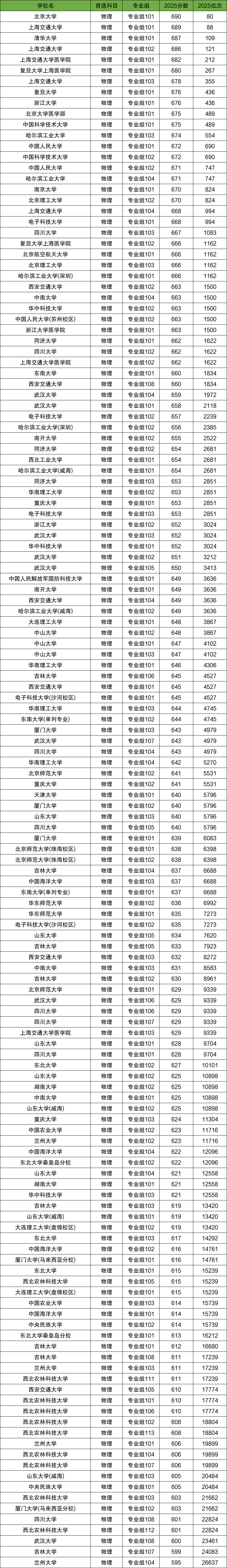 2025年在四川物理类本科批中985大学录取分数线最高的是北京大学专业组101,录取分数线为690分;录取分数线排名第2名的是上海交通大学专业组101,录取分数线为689分,对应录取位次88名;而录取分数线较低的985大学是兰州大学专业组104、吉林大学专业组107等,录取分数线均在600分以下;其他985大学在四川物理类的录取分数线为: