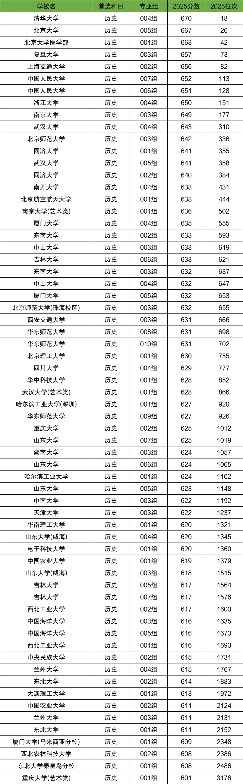 根据相关数据来看,在安徽历史类2025年985高校录取分数线中,清华大学004组(670分)、北京大学005组(667分)、北京大学医学部001组(663分)依旧稳居高分前三。重庆大学(艺术类)001组在安徽省历史类录取分数线为601分,最低录取位次为3176名,是39所985高校中招录的最低分,录取分数线较低的985大学还有东北大学秦皇岛分校001组,录取分数线608分;