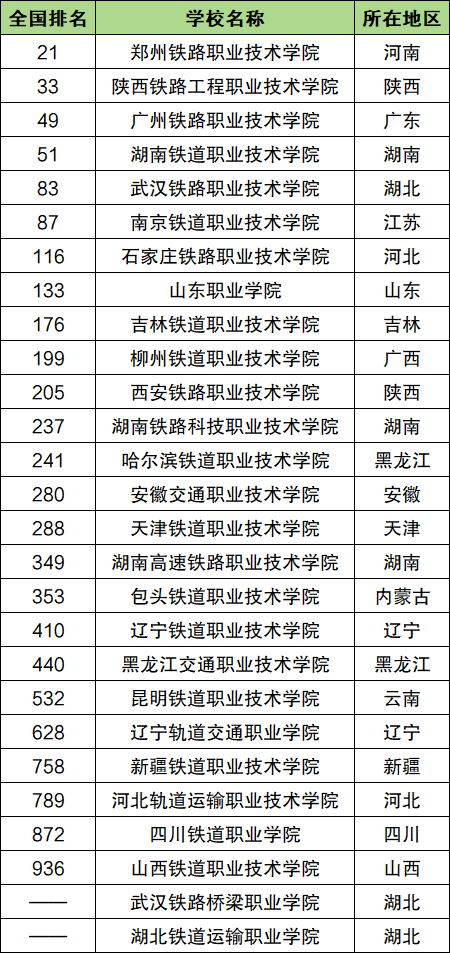 根据教育部公示的大学名单,全国铁道类高职院校名单排名及所在地区如下: