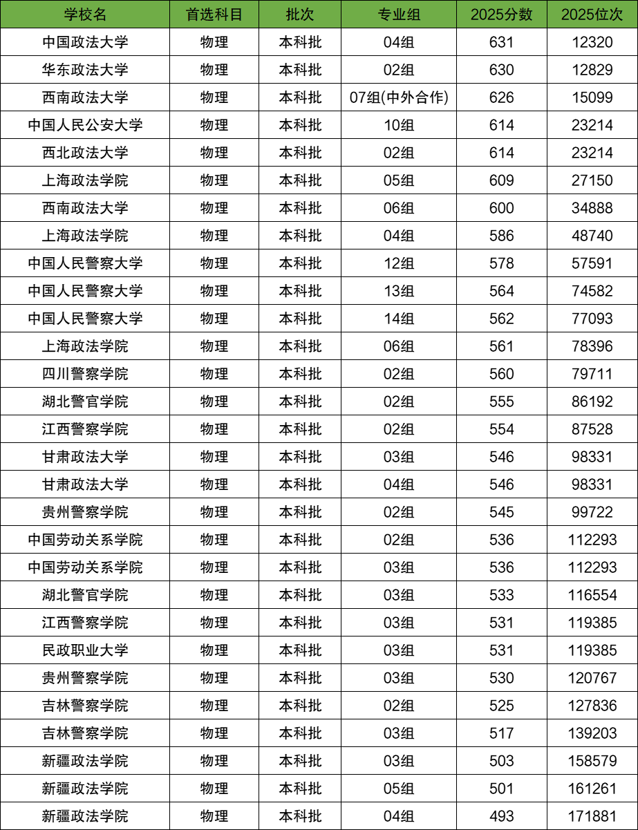 2025年共有16所政法院校在江苏物理本科批招生,共涵盖29个院校专业组,这些专业组的录取分在493-631分之间。