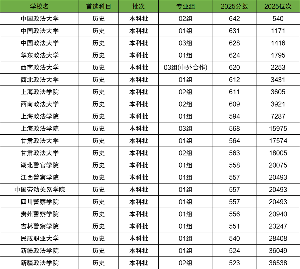 2025年共有14所政法院校在江苏历史类本科批招生,共涵盖21个院校专业组,这些专业组的录取分在523-642分之间。