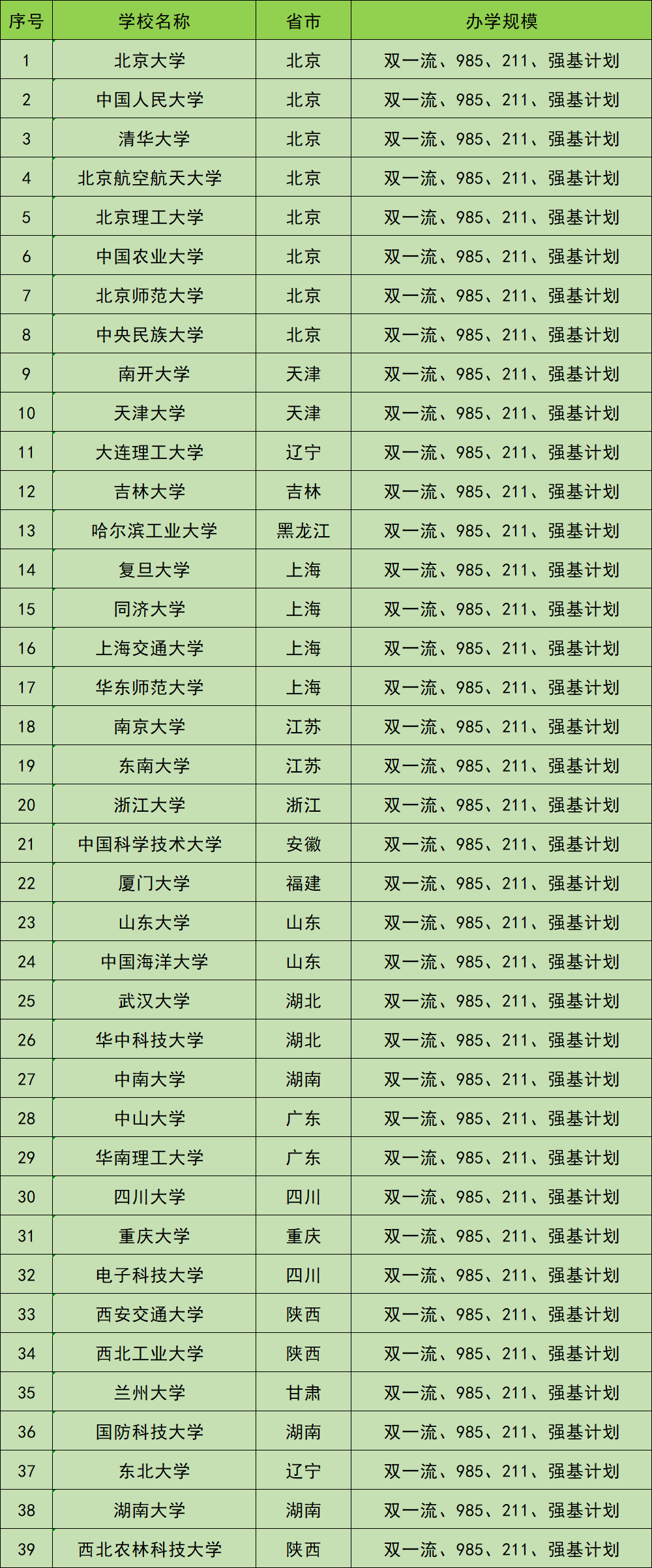 实施强基计划高校共有39所,分别是:北京大学、清华大学、上海交通大学、浙江大学、武汉大学、南京大学、复旦大学、中国科学技术大学等。