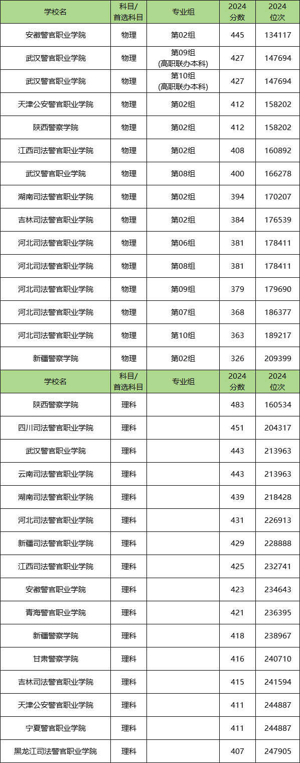 因为不同院校在不同省份地区的录取情况存在差异,且专科警察的院校较多,碍于篇幅限制,本文仅列举2024年湖北物理类和四川理科专科警察录取分数线情况,以供2025届考生参考。