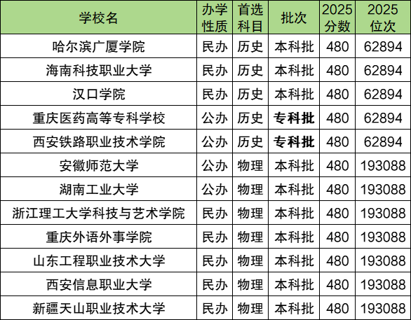 2025年河北高考历史类480分排名是62894名,可以上的大学有哈尔滨广厦学院、汉口学院、重庆医药高等专科学校、西安铁路职业技术学院等;物理类480分排名是193088名,可以上的大学有山东工程职业技术大学、湖南工业大学、新疆天山职业技术大学、重庆外语外事学院等。