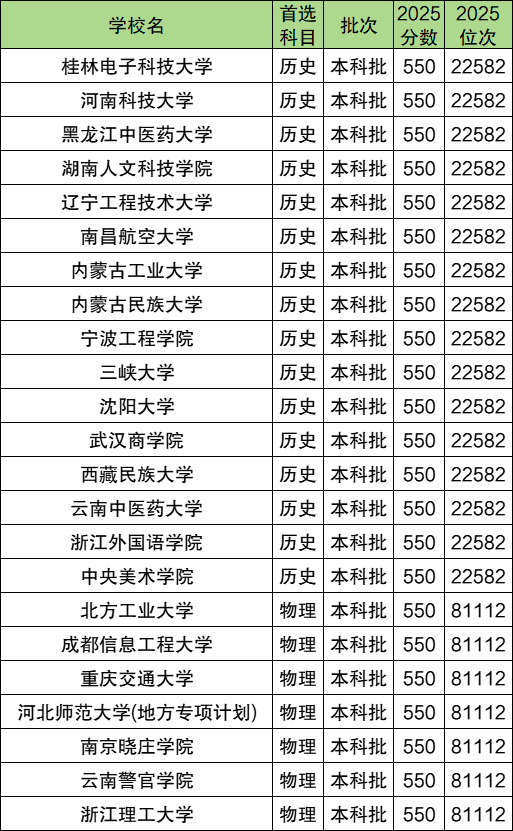 历史类550分排名对应大学有桂林电子科技大学、黑龙江中医药大学、南昌航空大学、宁波工程学院、武汉商学院、云南中医药大学等;物理类550分排名对应大学有成都信息工程大学、南京晓庄学院、浙江理工大学、云南警官学院等。