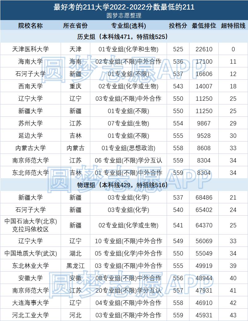 例如2022年历史类分数线最低的211大学是天津医科大01专业组,投档分与特招线525齐平;