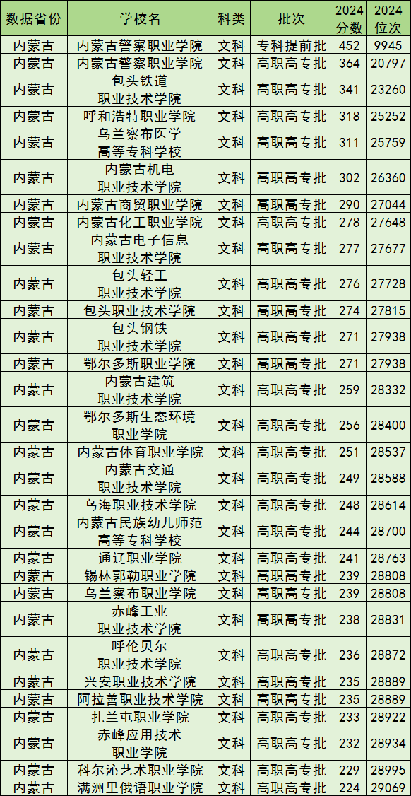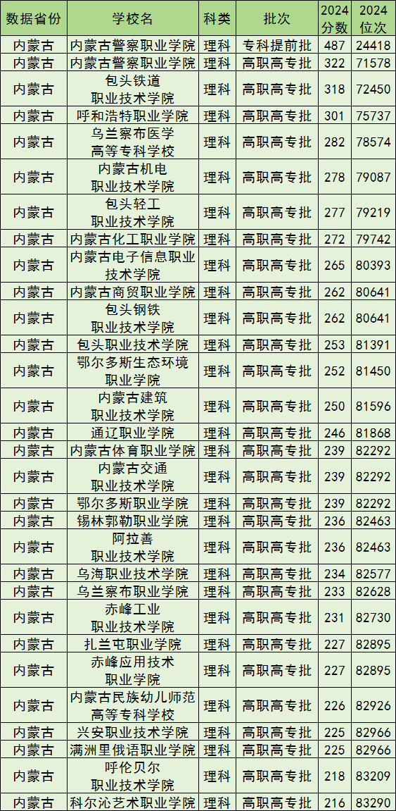 下面是2024年内蒙古公办大专院校分数线排名理科一览表: