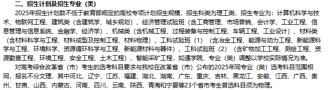 理工科:物联网工程、计算机科学与技术(华为天才少年基地班)、机械工程、过程装备与控制工程、车辆工程、工业设计、材料科学与工程、材料成型及控制工程、材料物理、冶金工程、能源与动力工程、新能源科学与工程、环境科学、资源循环科学与工程、新能源材料与器件、矿物加工工程、测绘工程、资源勘查工程、环境工程、安全工程、土木工程、智能采矿工程、建筑类(含建筑学、城乡规划);