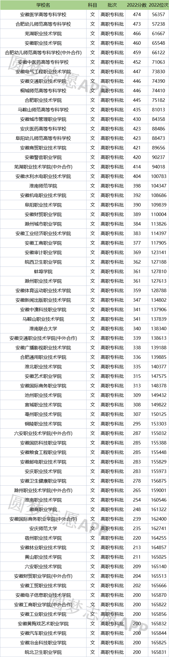 安徽文科最难考、收分最高的公办大专是:安徽医学高等专科学校,2022最低分474分,超专科线274分,对应位次56357名。