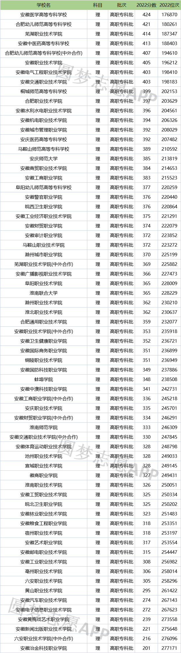 安徽理科最难考、收分最高的公办大专是安徽医学高等专科学校,2022最低分424分,超专科线224分,对应位次176870名。