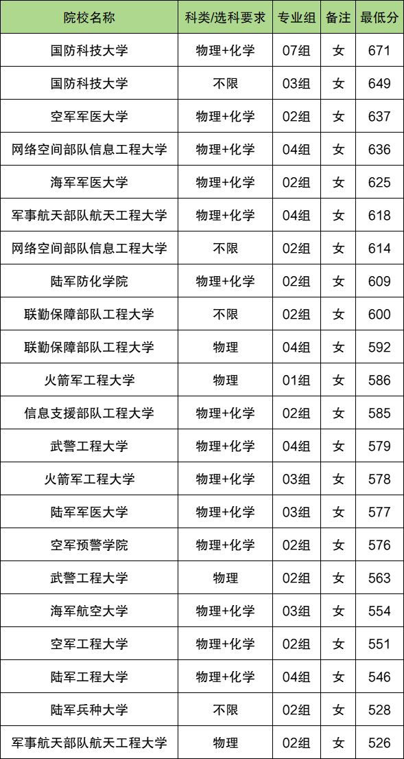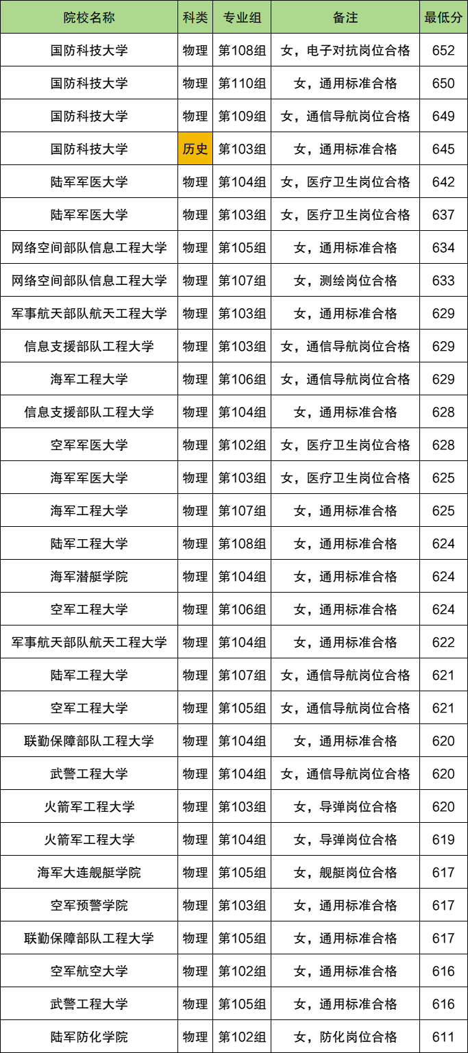 历史组女生可以报考的军校只有国防科技大学,2025年女生最低655分录取。